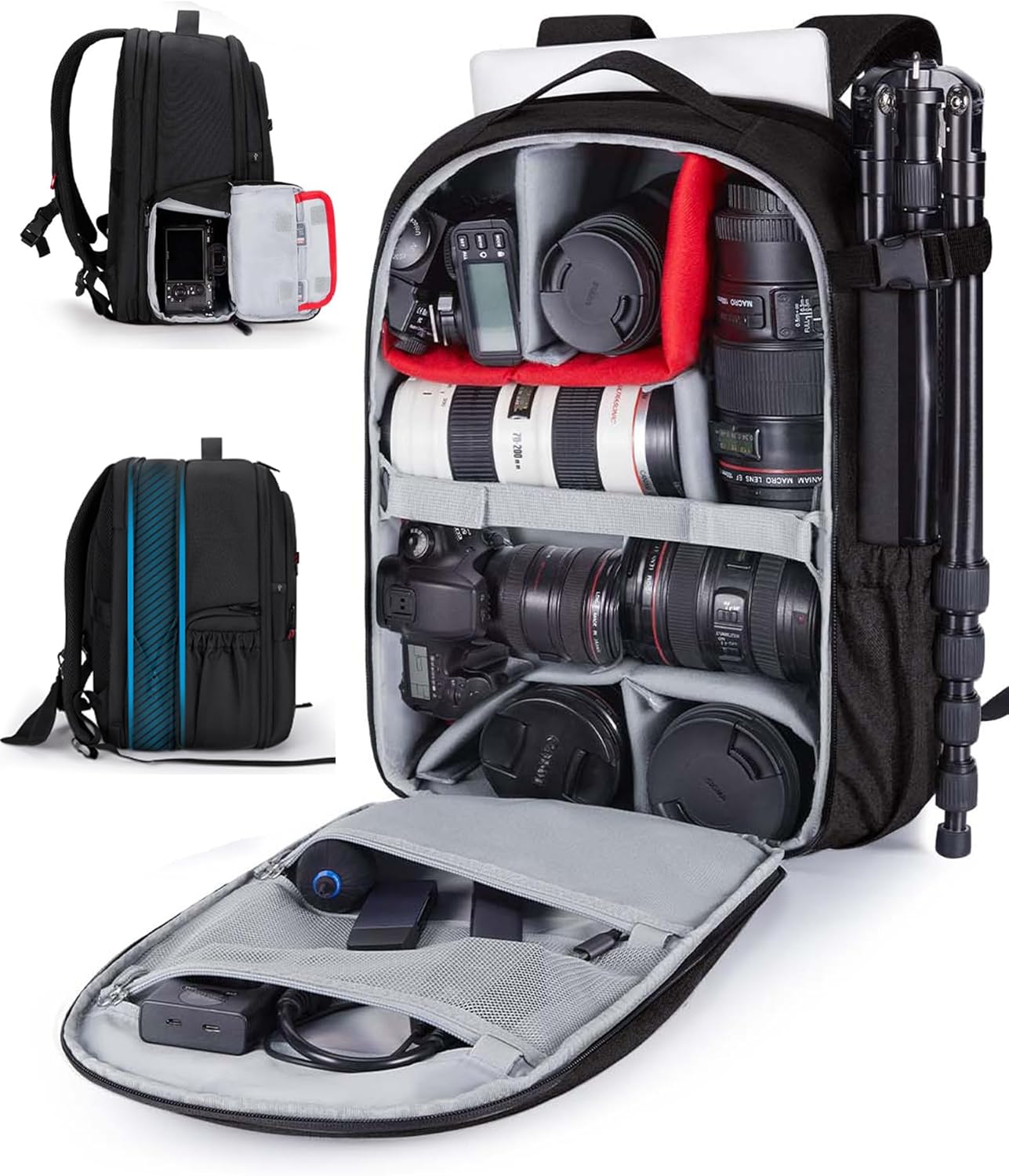 Designed for versatility, this photography travel backpack also includes a dedicated tripod holder, allowing you to conveniently carry your tripod with ease. The exterior is crafted from durable and water-resistant materials, complete with a rain cover to protect your gear from unpredictable weather conditions.